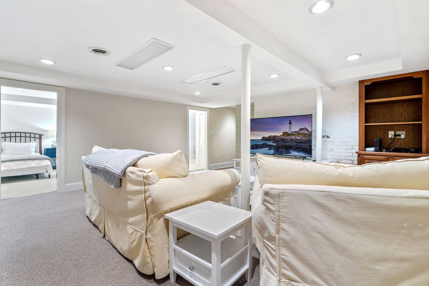 KEY FEATURES: ☀️ Sleeps 12 across 5 bedrooms and 8 beds - 2 king, 1 queen, 2 full, 3 twin ☀️ 3.5 bathrooms - 1 full w/ shower/tub combo, 2 full w/ shower, 1 half ☀️ Heated pool (available June 2-September 15) with lounge chairs and outdoor furniture ☀️ Boardwalk with private access to the ocean ☀️ Dedicated workspace ☀️ 3 separate living rooms, each offering its own charm ☀️ 350MB satellite wifi and Roku Smart TVs throughout the home ☀️ Modern and fully equipped kitchen w/ top-of-the-line appliances ☀️ Board games and kids toys ☀️ Exercise room stocked with yoga mats, free weights and exercise bands ☀️ Dog and family-friendly! Pack n' Play, highchair and other child-friendly amenities provided ☀️ Patio with grill and outdoor dining furniture Here Are A Few Kind Words From Past Guests: "Fabulous family vacation in this beautiful home! Terrific location for exploring the Maine coast or just staying put and relaxing in the pool! We were a multigenerational family of 9 and the house was perfect! The grandkids loved the pool floats, playing wiffle ball in the yard and roasting marshmallows over the fire in the fire pit. There was space for everyone with 2 living areas on the main floor and one in the lower level. The beds and bedding were very comfortable and the primary suite was amazing with a huge walk in closet! The kitchen had everything you need! Kayla and Nick were very responsive throughout the booking and stay process. If you are looking for a great place to call home away from home this checks off all the boxes." - Julie K. "The hosts were excellent and responsive. The home was very clean and comfortable with lots of amenities. This location provided convenient access to Portland, and surrounding beaches. It was possible to take in the Acadia National Park from here, but it was a full day (dawn to dusk) to travel to and enjoy park. The family already wants to come back! Crescent Beach was awesome (small park fee)." - Cody W. ☆☆ BEDROOMS ☆☆ This coastal Maine gem boasts 5 bedrooms accommodating 12 guests. The main level primary suite offers a private oasis with a gas fireplace, ensuite bathroom, king-size bed, and a 55" Smart TV. There are built in dresser drawers as well as a walk-in closet tucked off of the ensuite bathroom for additional storage. The second floor features two generously sized bedrooms with a shared full bathroom. One bedroom features a king-size bed with a dresser and a closet. The other features a queen-size bed and a twin over full bunk bed. This room also has a dresser as well as a closet. There is an additional walk-in closet on the second floor for extra storage space if needed. The basement provides two additional bedrooms. One bedroom is fitted with a queen-size bed, a dresser and a closet. The other bedroom has two twin-size beds, a dresser and a closet. ☆☆ BATHROOMS ☆☆ There are three full and one half bathrooms in the home, each of them stocked with all the essentials you need for the duration of your stay. The half bath is located in the home's entryway right around the corner from the kitchen for first floor convenience. The master bedroom has a spacious ensuite bathroom with a beautiful glass enclosed shower. The second floor bedrooms share a spacious full bathroom which has a tub for those seeking a relaxing water-drawn bath. The third full bathroom is located downstairs, allowing your basement-bunking guests a convenient option to rinse off in the standing shower. ☆☆ KITCHEN, DINING AND LIVING ROOMS ☆☆ The bright and airy kitchen is fully equipped with all the appliances, utensils and cookware you need to feel at home. It offers ample counter space, high-end appliances, and an island for casual meals. The dining room, adjacent to the kitchen, provides a formal setting for large gatherings with family and friends. The main dining table seats 8, and there is additional seating for 4 at a round dining table, as well as 3 more seats at the kitchen island. The main floor features two bright and open living rooms with large windows, ideal for relaxation and entertainment. The first living room, located right outside the kitchen, features a beautiful brick fireplace and a 55" Smart TV, allowing full access to your favorite streaming services. The second living room is also located on the main floor. It allows seating for 8-10 people around another magnificent fireplace. There are large ocean-facing windows which let in ample natural light. Please note that the ocean views are seasonal as there are trees as well as one house between this home and the water. The entire first floor has 9-foot ceilings that lend an open and airy ambiance. A third living room area is located in the basement. This room features seating for 4-6, a 60" Smart TV and shelves full of board games for rainy day activities. Also downstairs is a workout room stocked with basic exercise essentials, as well as a separate study equipped with a work desk. ☆☆ OUTSIDE SPACE ☆☆ Step outside and you'll discover an oasis in the backyard with an in-ground heated pool that invites you to cool off during hot summer days. The pool area includes lounge chairs and outdoor furniture and is available to guests from June 15th through September 15th. The beautifully landscaped yard with amazing perennial gardens and patio area provides the perfect setting for outdoor gatherings, barbecues, and relaxation. A new private association boardwalk was built in 2022 giving guests access to a private beach. Please note that that boardwalk is pretty long (50+ steps) and the beach area is really only usable during low tide. You will feel that you got some steps in when returning back up the boardwalk to the house. There is a fire pit with ample seating to roast marshmallows and tell stories around the fire. ☆☆ ADDITIONAL GUEST EXPERIENCES ☆☆ Looking to make your stay extra special? We partner with local businesses to help take you
