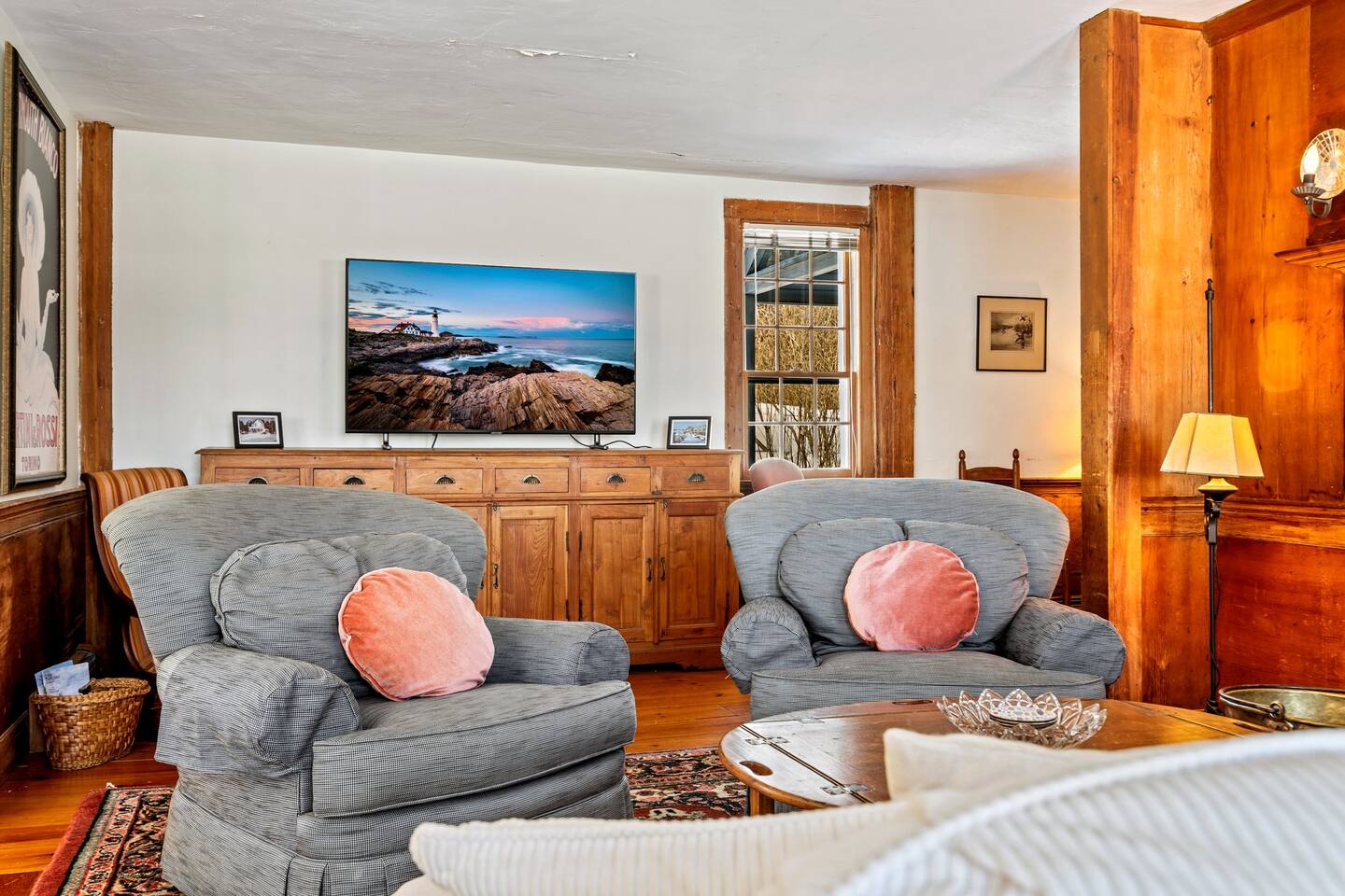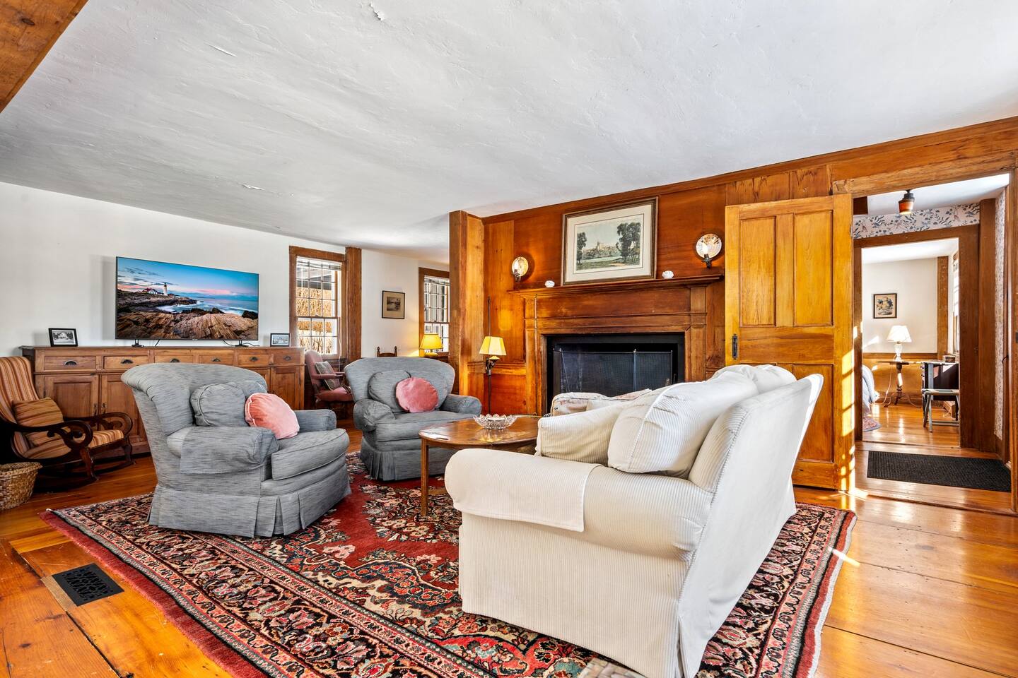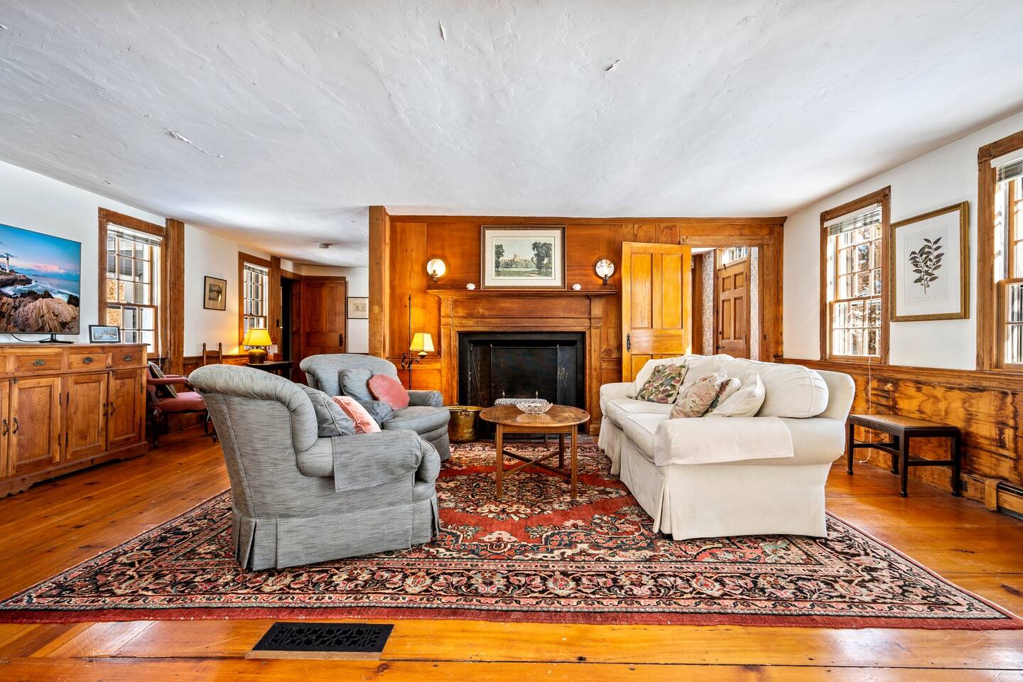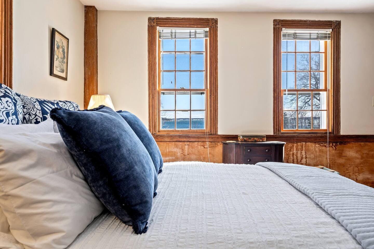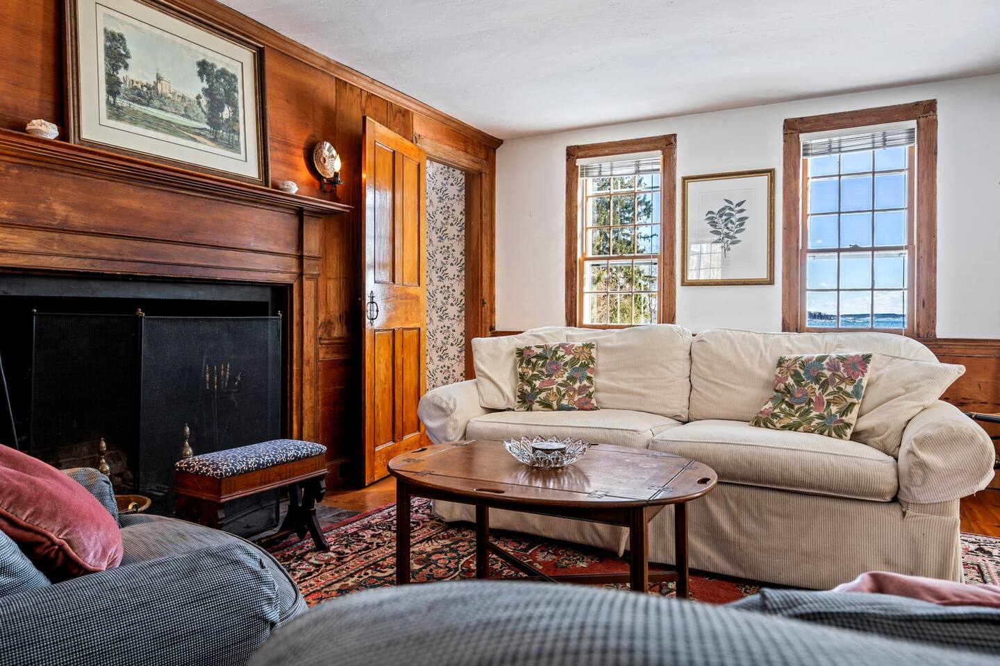 Please note that there is one additional house located past our home, so you may occasionally see cars passing the front of the house. The staircase to the 2nd floor of the historic wing is steep, so caution should be exercised. Guests will have access to all described rooms and amenities. There is parking in the top driveway for 2-3 vehicles, and parking in the lower driveway for 4-5 more. Guests are welcome to use the home’s 2 car garage, as well as the washer and dryer located in the basement. All bedrooms, except the office, will have window AC units in the summer. The large common areas of the house do not have AC but have many windows perfectly positioned to catch all the afternoon ocean breezes. We also have portable fans in each room. Swim shoes are recommended if enjoying the home's private beach area! All fireplaces in the home are ornamental and NOT for guest use. You’ll receive a code for the smart lock for secure and easy entrance into the home. 2 dog maximum, $200 pet fee applied to reservation.