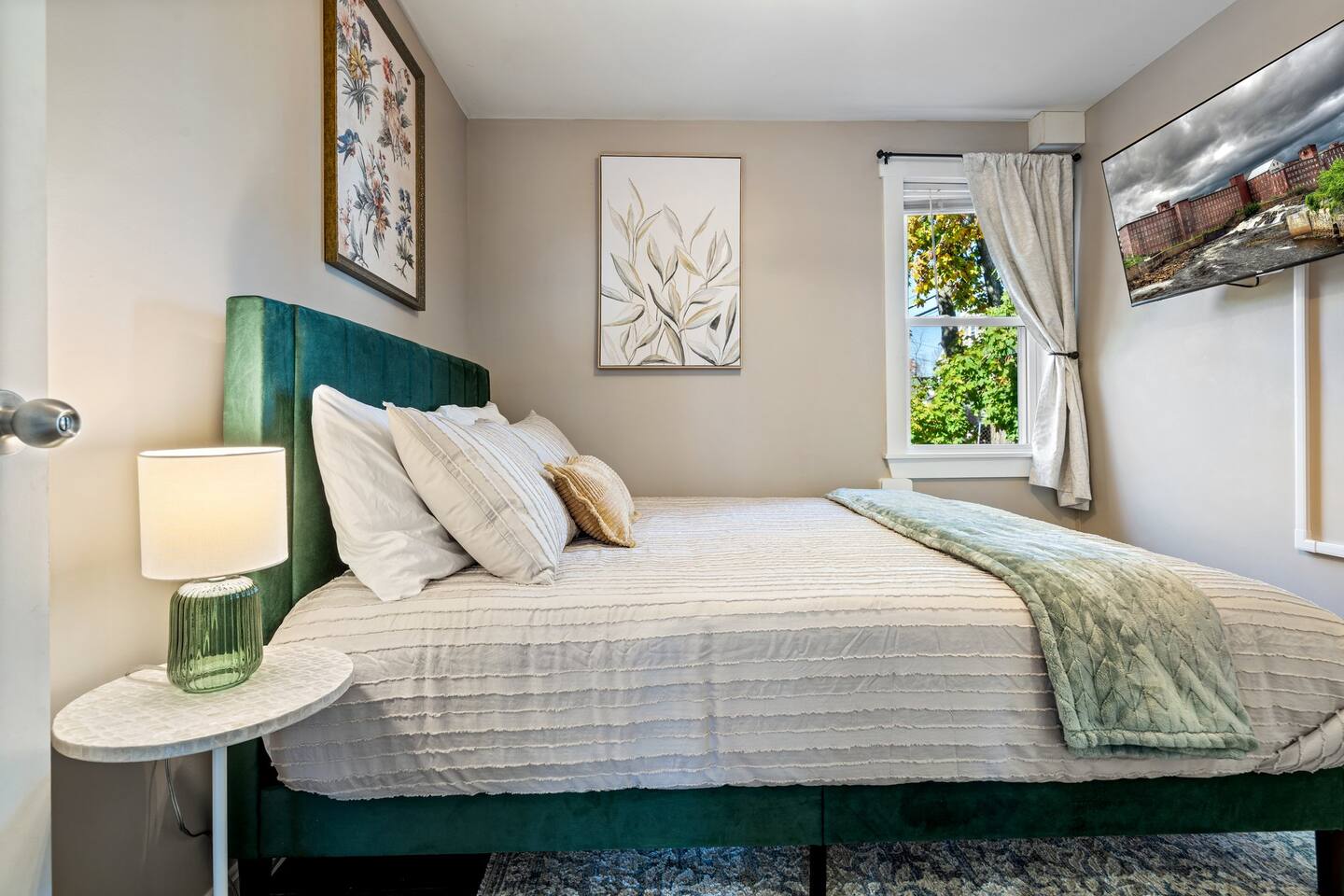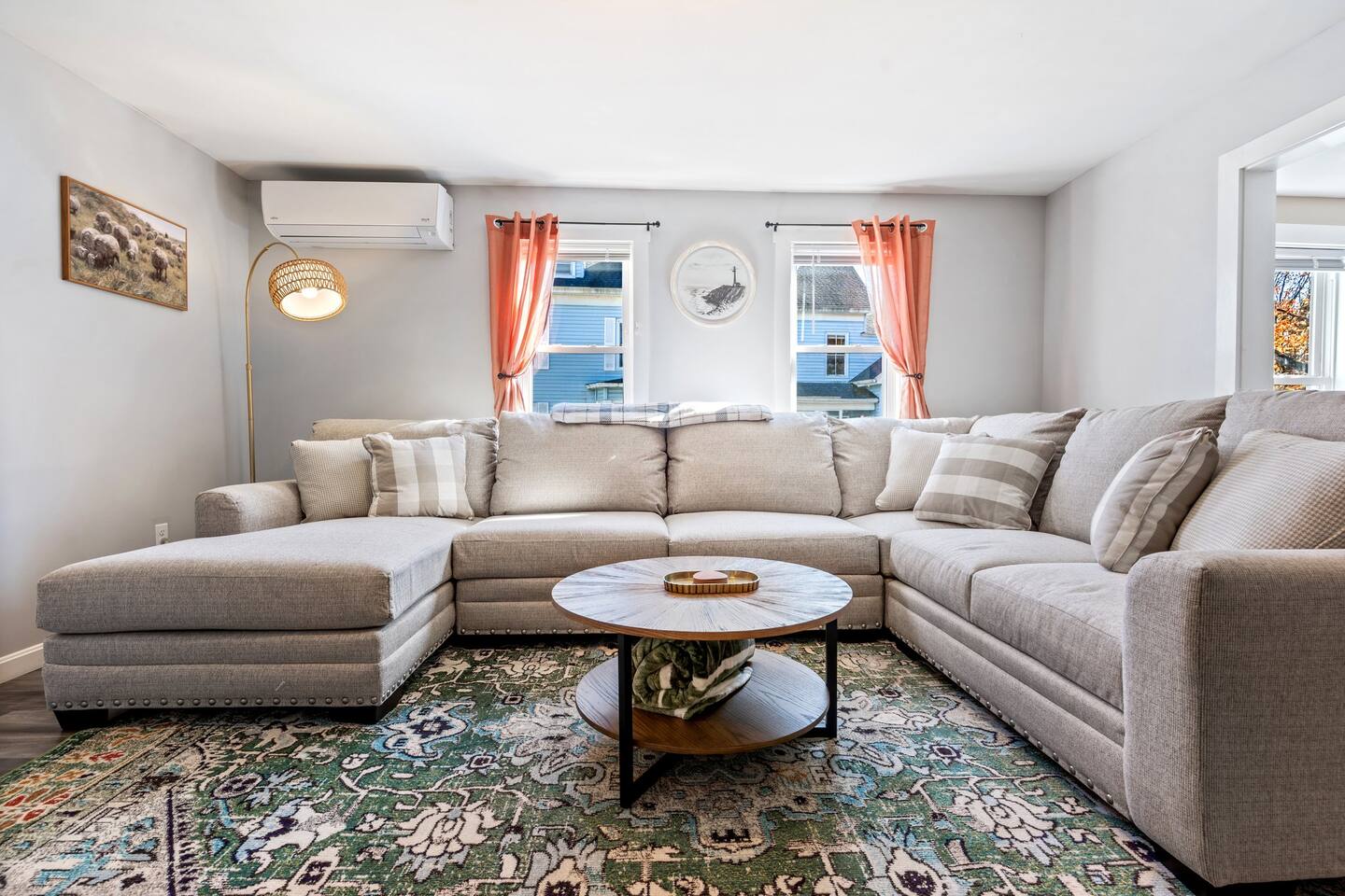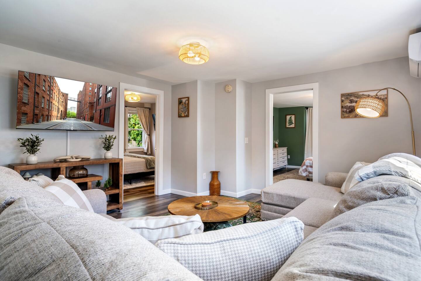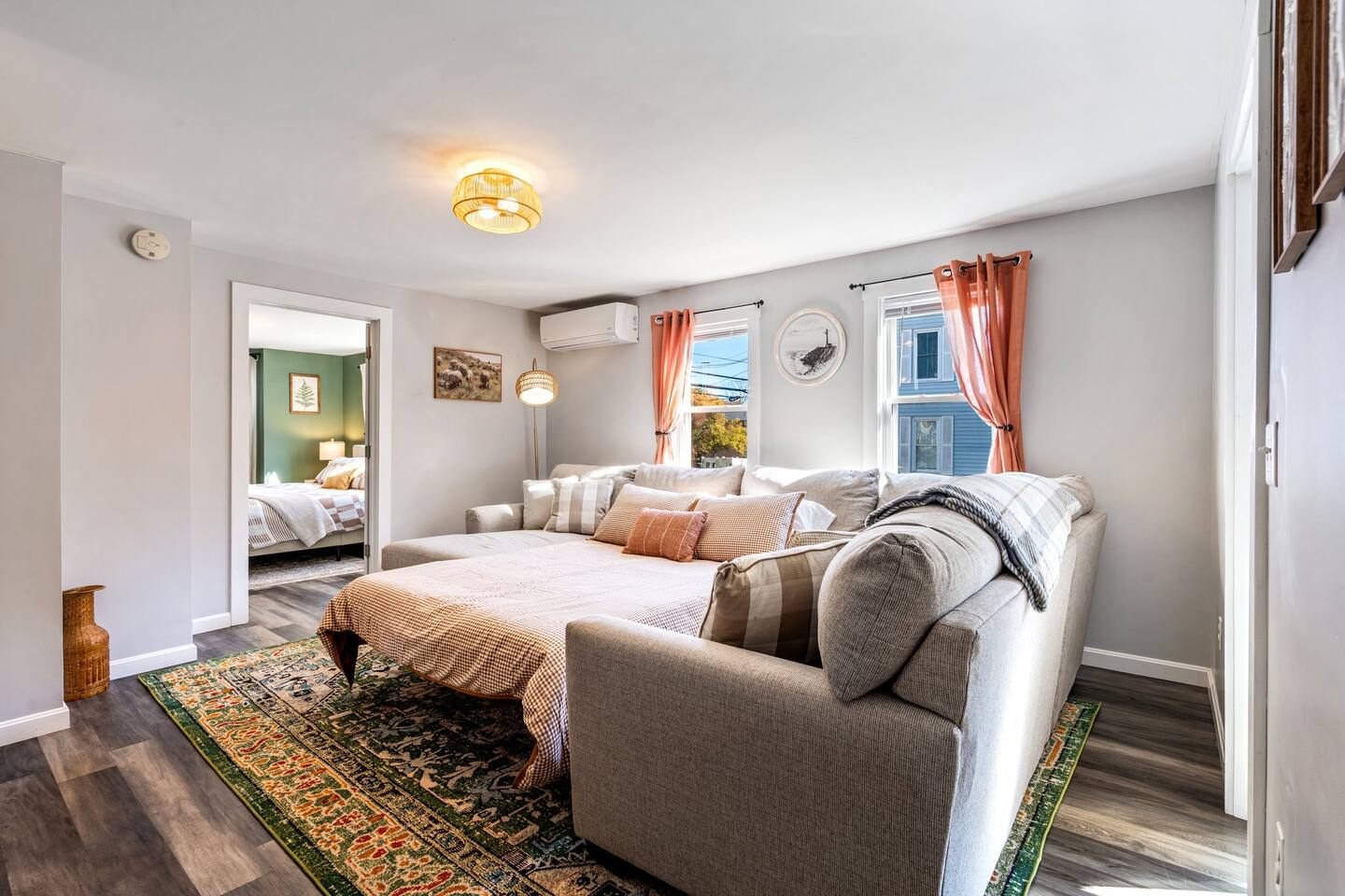 Guests will have access to all described rooms and amenities. PLEASE NOTE this apartment is located in a 3-unit building. There is a very friendly longtime tenant who lives above The Downtown Den, and you will hear him coming and going at times. We have noise machines in each bedroom to help any light sleepers who like to catch that extra hour of beauty sleep :) The apartment is about 1,100 square feet total. The living room has a heat pump for AC, and each bedroom has window AC units during the summer. The apartment has baseboard heating controlled by a thermostat. There is parking for 4 vehicles in the driveway, as well as free street parking available. Youβll receive a code for the smart lock for secure and easy entrance into the home. Please note there is a large run down Victorian home right next door that is owned by the City of Biddeford. It can cause a minor unsightly view once you're first getting to the property. The city is scheduled to start renovating the building in the summer of 2025 and we can't wait to see it restored to its original beauty!
