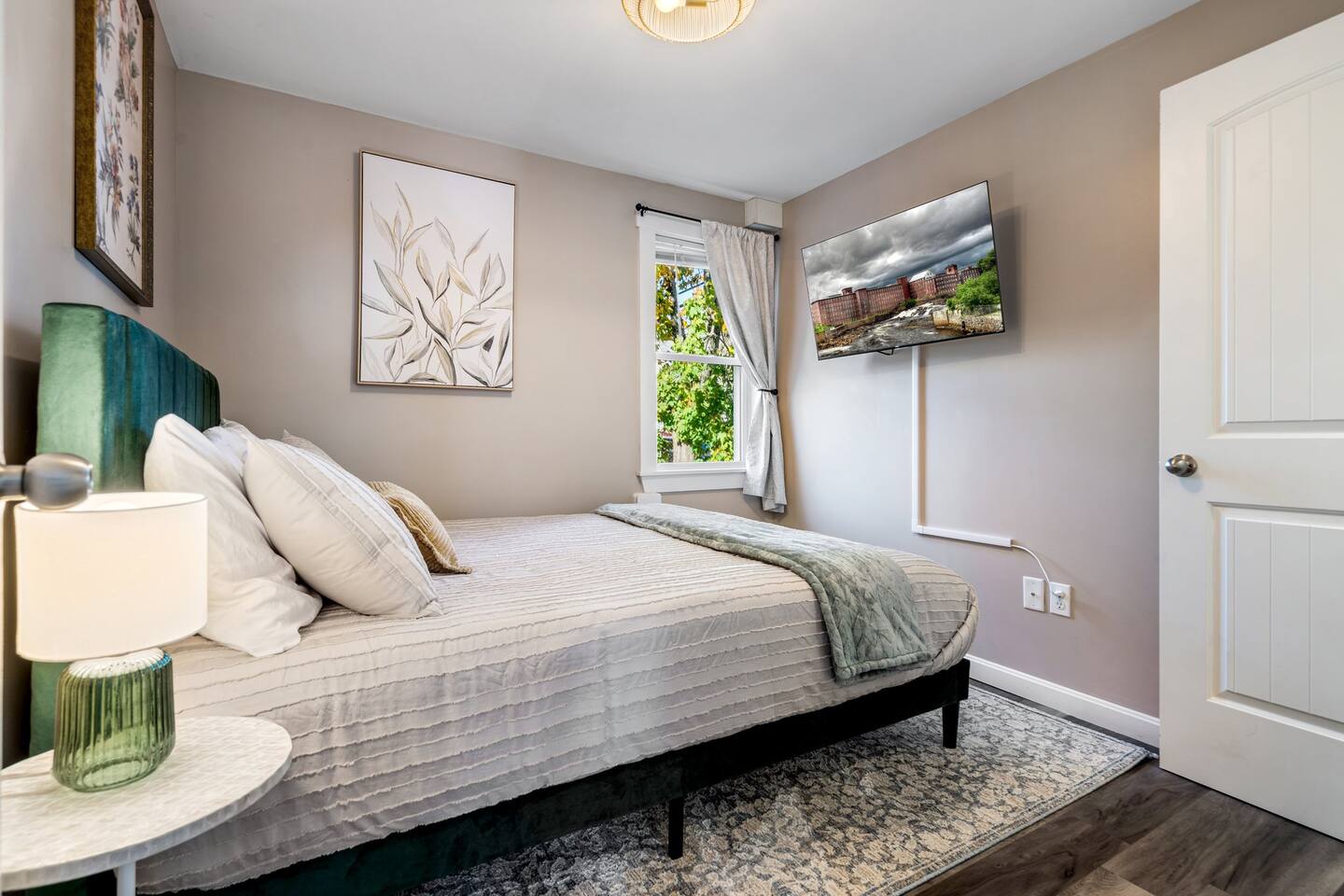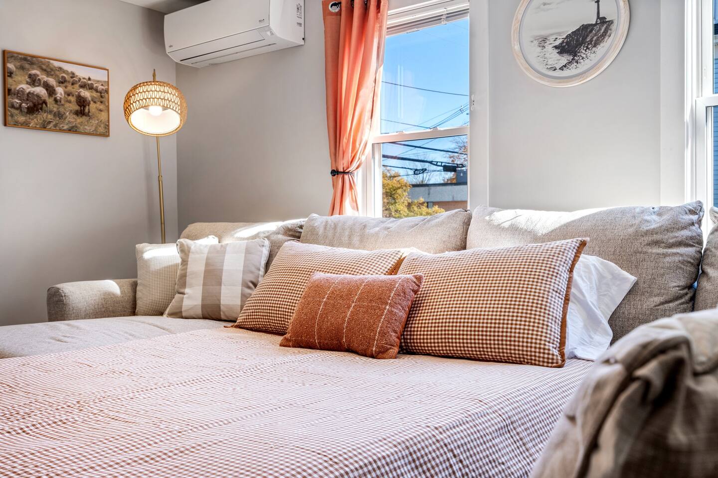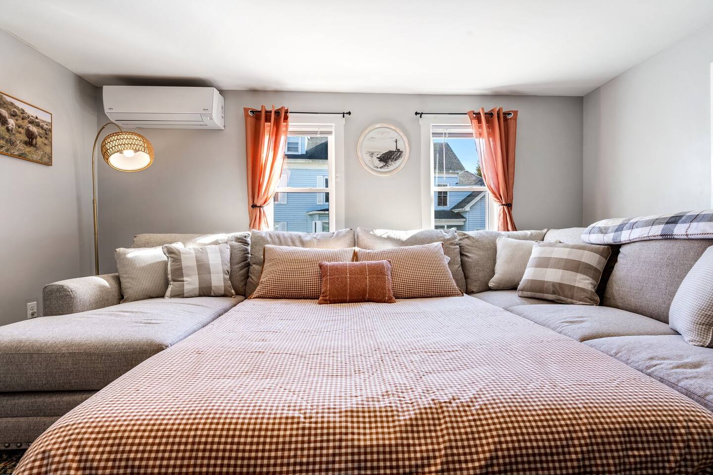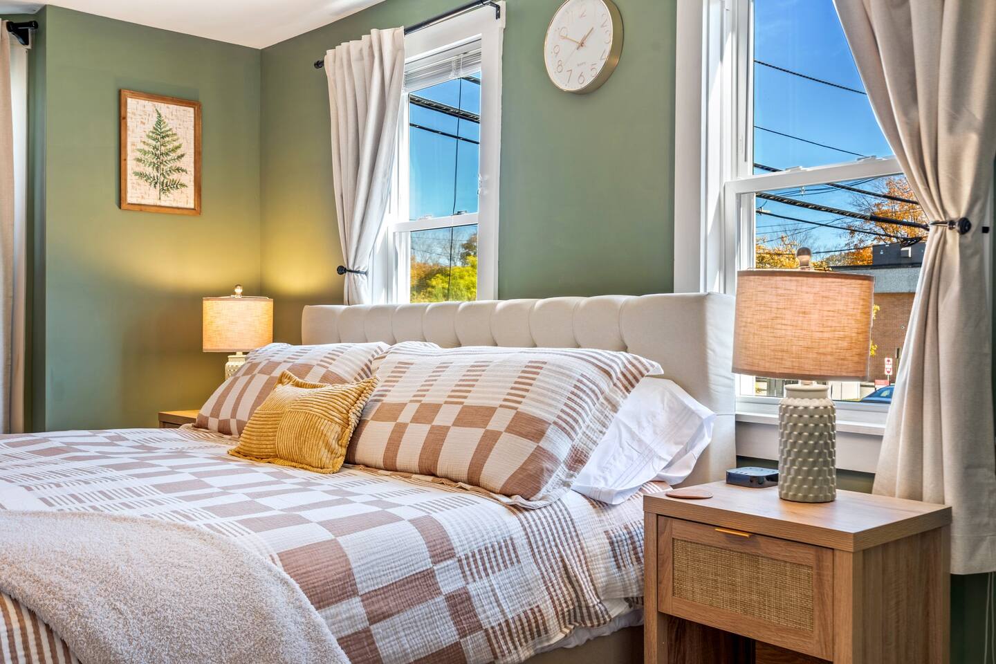Guests will have access to all described rooms and amenities. PLEASE NOTE this apartment is located in a 3-unit building. There is a very friendly longtime tenant who lives above The Downtown Den, and you will hear him coming and going at times. We have noise machines in each bedroom to help any light sleepers who like to catch that extra hour of beauty sleep :) The apartment is about 1,100 square feet total. The living room has a heat pump for AC, and each bedroom has window AC units during the summer. The apartment has baseboard heating controlled by a thermostat. There is parking for 4 vehicles in the driveway, as well as free street parking available. Youβll receive a code for the smart lock for secure and easy entrance into the home. Please note there is a large run down Victorian home right next door that is owned by the City of Biddeford. It can cause a minor unsightly view once you're first getting to the property. The city is scheduled to start renovating the building in the summer of 2025 and we can't wait to see it restored to its original beauty!